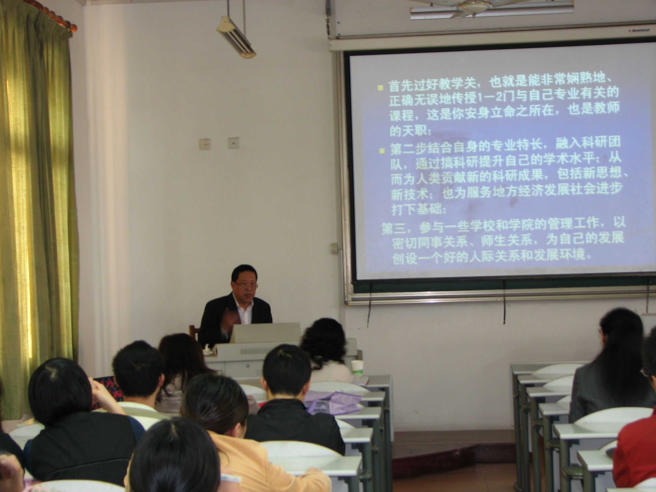 讲座中,夏书记结合青年教师的实际,做了细致的分析,分别从青年教师的职业定位;青年教师正确定位对自身的意义以及正确处理自身发展与学校发展的关系几个方面进行了深入的剖析和讲解。并对青年教师提出了三种追求:教学工作出色、科研搞得好、管理工作搞得好几个方面。另外,夏书记对青年教师的期望很高,同时教会大家“备”课而不是“背”课。