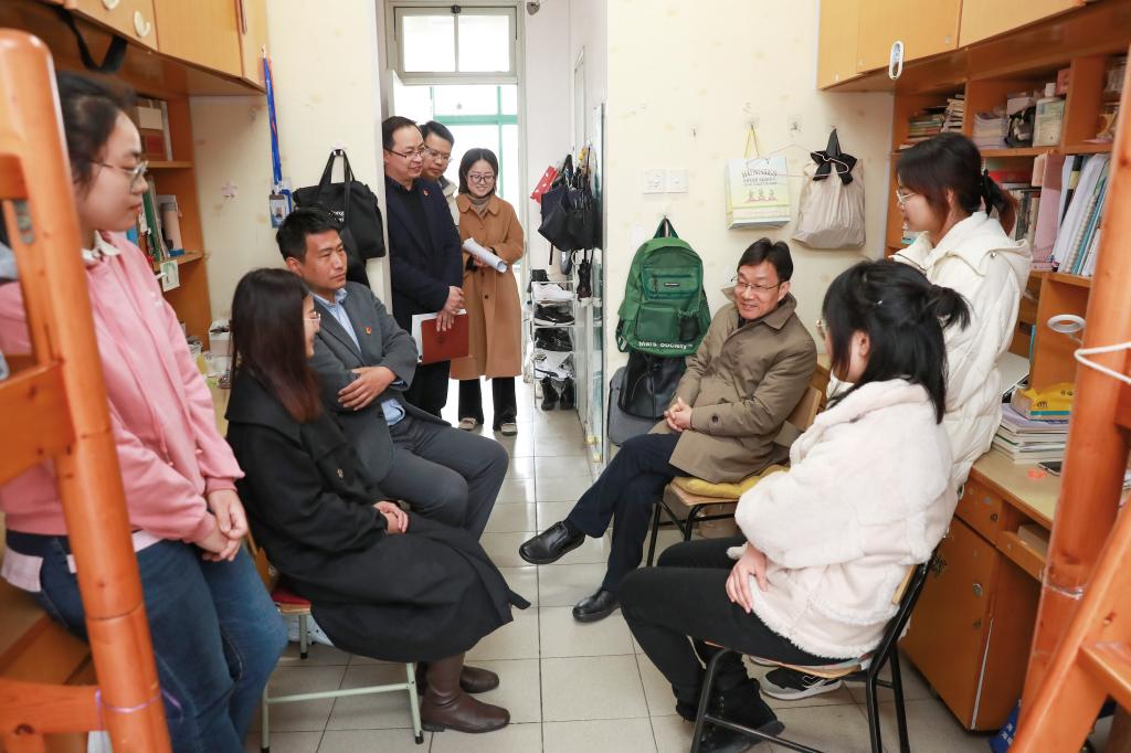 2月28日下午,校党委书记卢新波走访91短视频 学生寝室看望返校学生,党校办主任王立玮、91短视频 党委副书记杨燕群随同走访。