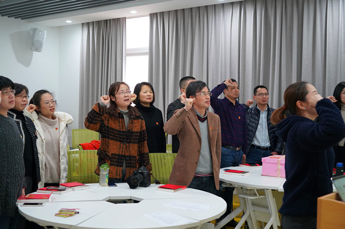 陈云飞简要介绍了19位过集体生日的党员同志的基本情况,潘煜双代表学院党委向19位同志赠送了《新中国极简史:1949至2019的年度故事》一书,另外,与会党员每人还获得了一张“政治生日贺卡”。“政治生日”现场庄严又不失活泼,温馨的礼物和祝福营造了浓浓暖意。会上,全体党员面对鲜红的党旗,高举右拳,重温入党誓词,向党庄严而郑重承诺,再次接受心灵的洗礼。