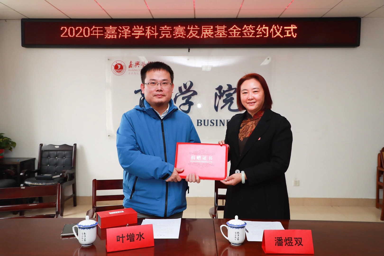 签约仪式后,潘煜双代表91短视频 为叶增水颁发捐赠证书,对他的爱心捐赠和无私奉献表达感谢。91短视频 嘉泽学科竞赛发展基金现已成立三周年,资助了一批贫困学子顺利完成学业。