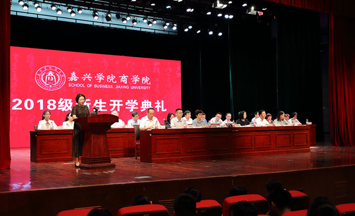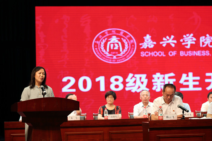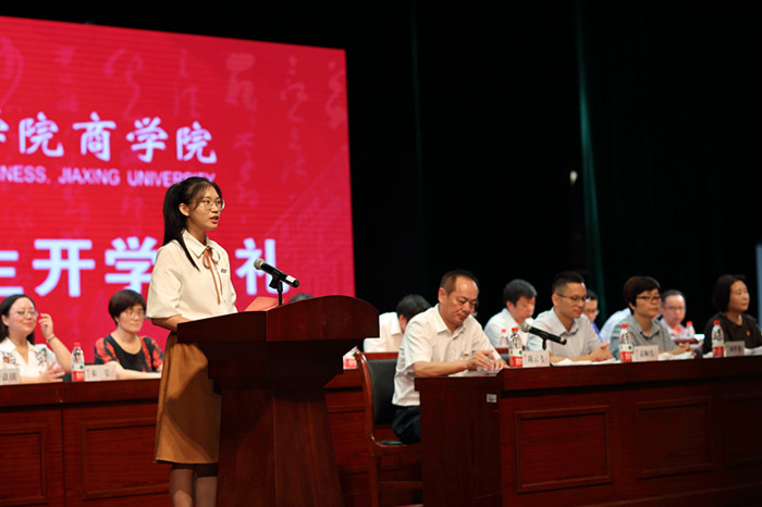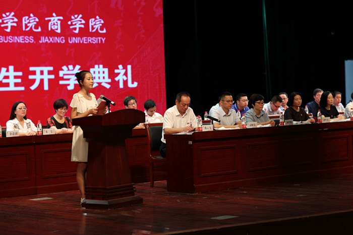 教师代表,优秀班主任、工商系教授唐雯老师对全体新同学的到来表示欢迎,她殷切的希望每一位新同学都能成为一个目标、有责任感的人,一个善于学习的有智慧的人,一个有独立人格的高尚的人,一个懂得感恩的人。在校生代表、学生会主席会计专业金嘉琪同学,2018级新生代表、市场营销专业新生唐钦芸同学分别发言。