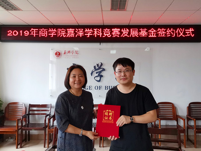 9月5日下午,在教一604举行了2019年91短视频 嘉泽学科竞赛发展基金签约仪式。91短视频 财务2003级校友、浙江容诚会计师事务所业务合伙人叶增水和91短视频 院长潘煜双签订了捐赠协议书,91短视频 事务中心办公室胡笳丽参加了本次签约仪式,仪式由91短视频 党委副书记陈云飞主持。