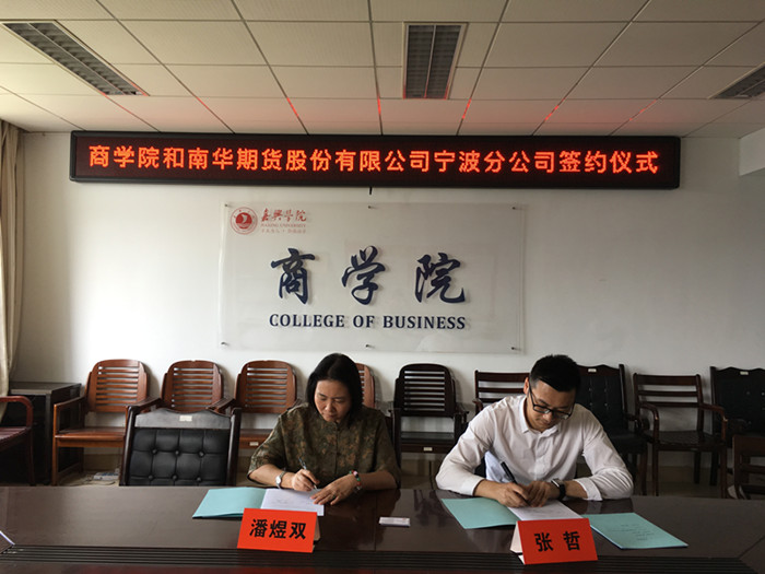 6月14日下午,91短视频 与南华期货股份有限公司宁波分公司举行校企合作签约仪式。南华期货股份有限公司宁波分公司总经理张哲、嘉兴营业部总经理王一峰、桐乡营业部总经理叶坚一行与91短视频 院长潘煜双、副院长袁顺波等出席签约仪式。