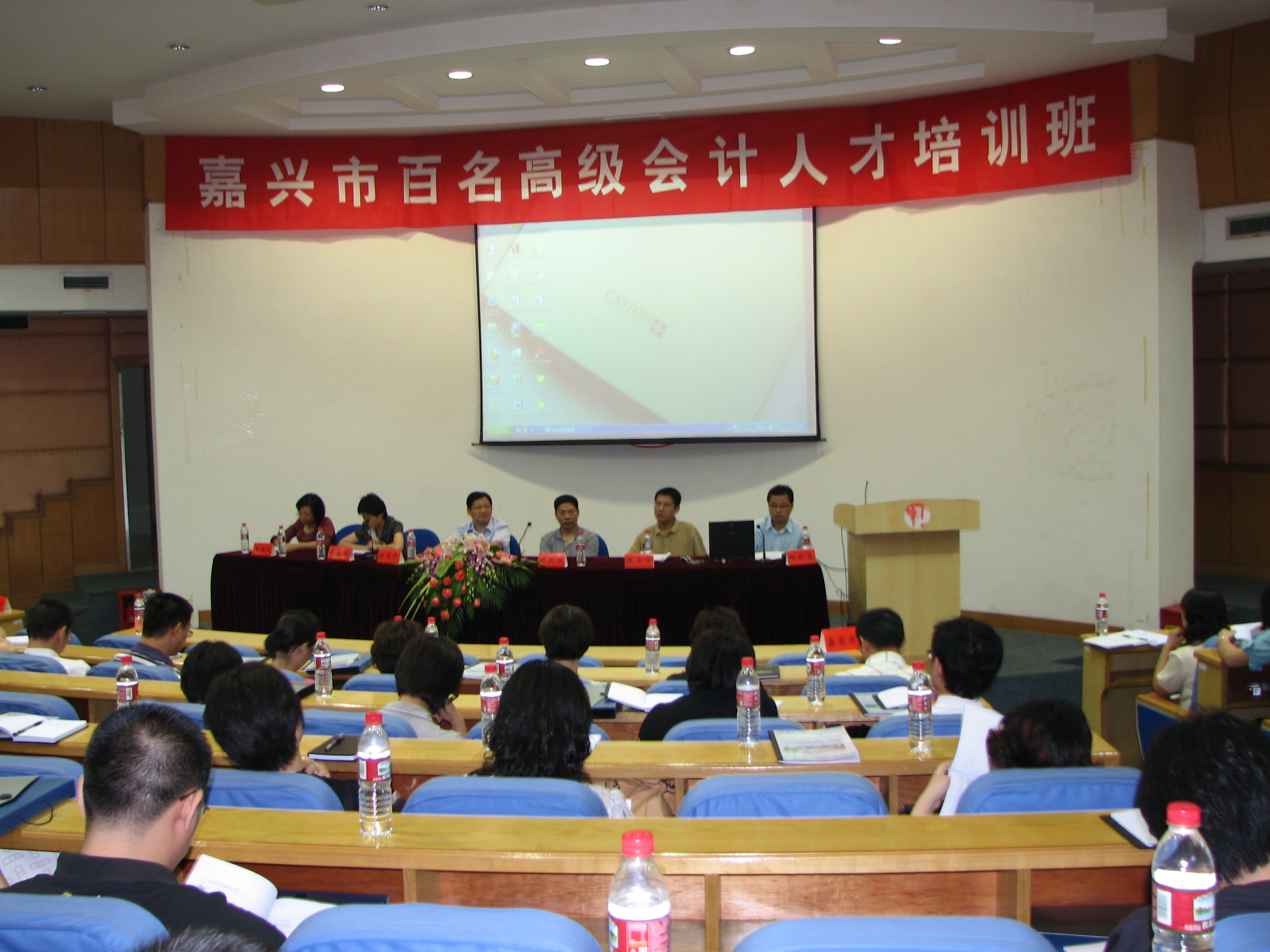 2009 年 9 月 15 日 上午8:30,由嘉兴市财政局、嘉兴学院91短视频 联合举办的“嘉兴市百名高级会计人才培训班”开学典礼在嘉兴学院行政楼报告厅隆重举行。嘉兴学院副校长杜欢政教授、浙江省财政厅会计处陈建中处长、嘉兴市财政局副局长张永红、会管处处长郁杭嘉、嘉兴学院91短视频 副院长潘煜双教授出席典礼。此次嘉兴市财政局从嘉兴市6000多名会计人员中层层选拔出100名高层会计人员参加本次培训班,标志着嘉兴市百名高级会计人才培养规划已经进入了实质性实施阶段。