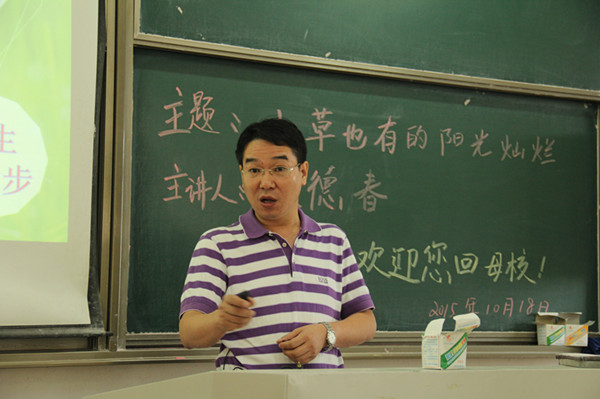 张德春校友以舒缓的“小草”音乐开场,营造了温馨的氛围,同时结合“三点说明、三段经历、三个方面”,分享了一场以“小草也有的阳光灿烂”为主题的讲座。他根据自己的实际经历,从在校大学生的角度,对大家工作和生活提出了许多建议。他说“在工作中,要自信,看得起小事;要用心,善用乘数法;要坚持,积跬步致千里;要善学,理解到宽容到包容”。“在生活中,要辩证的看待快乐和忧愁;要乐观豁达,勿自寻烦恼;要学会淡泊,慈悲待己”。最后,他以“平凡、坚韧”的小草精神,鼓励大家:“只要拥有坚韧的信念,就会迎来属于你们的奇迹!”
