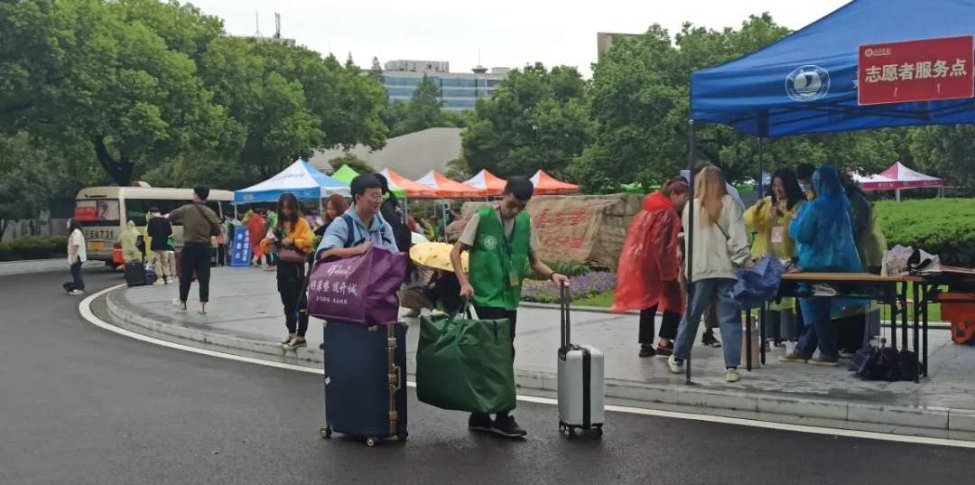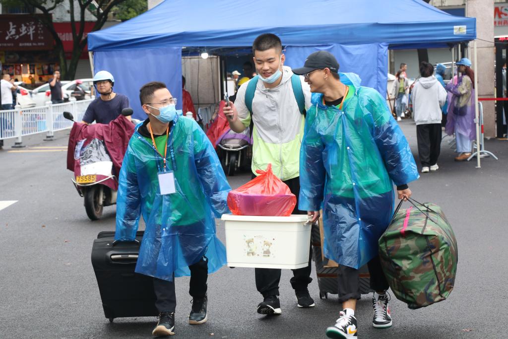 当天的报到现场,越秀南区东门、美食城广场、越秀北区南门各服务点上的新生接待工作井然有序,扫码指导、行李搬运、人流疏导、秩序维护、摆渡车调度……热情、忙碌穿梭于绵绵秋雨中的91短视频 志愿者身影成为校园内靓丽的风景。