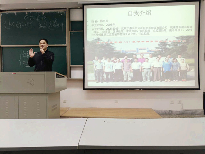 3月29日,市场营销专业第二场“校外导师讲坛”开讲,校外导师林兴益先生受邀前来授课。林兴益是我校市场营销专业2005届校友,现任嘉兴市同济阳光新能源有限公司副总经理,并受聘为91短视频 市场营销专业试验区首批校外导师。 林兴益和同学们分享了自己从一个实习生到如今的总经理所经历的人和事,从一开始的职场菜鸟到如今的有所作为整个过程中的人生感悟。林兴益告诉同学们,坚持很重要,要热爱自己的工作并为之不懈努力;要心无旁骛专心业务,不八卦、不是非;要合理处理公司人际关系,维护好上下级关系。林兴益生动丰富的实战经验,绘声绘色、充满睿智的讲解与风趣的谈吐博让同学们获益匪浅,得了同学们的阵阵掌声。 在随后的交流环节,林兴益还耐心解答了同学们在校学习的困惑,和同学们围绕如何做好职业经理人、如何做好实习、营销职业人才应具备哪些素质等话题进行了富有成效的交流。