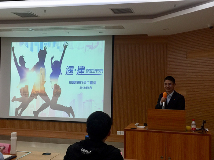 最后,大学生行员们还聆听了分行人力资源部王任刚见习副经理为“校园e银行”做的“遇建你的未来”主题讲座。王经理通过对建行嘉兴分行的企业文化、发展历程的介绍,结合多年的人力资源经验给大学生行员们分享了职业生涯规划、招聘就业等内容。讲座结束,大学生行员们参观了行史陈列室、职工之家,近距离地感受到了建行“快乐工作健康生活”的浓浓氛围。