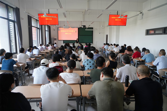 院长潘煜双结合学校中层干部学习会精神的传达,回顾总结了学院2021年度上半年工作、暑期工作,围绕工商管理一流学科申报、硕士点培育,会计专硕招生准备工作,专业内涵建设以及社会服务等几个方面入手,对本学期的工作进行了布置,着重对新一轮岗位聘任工作进行了动员。潘煜双重点就今年聘岗的特点以及学院的岗聘工作的进展情况进行了说明。她表示,学院一定会在公开透明的基础上做好本次的聘岗工作,也希望老师们能正确对待本次聘岗。
