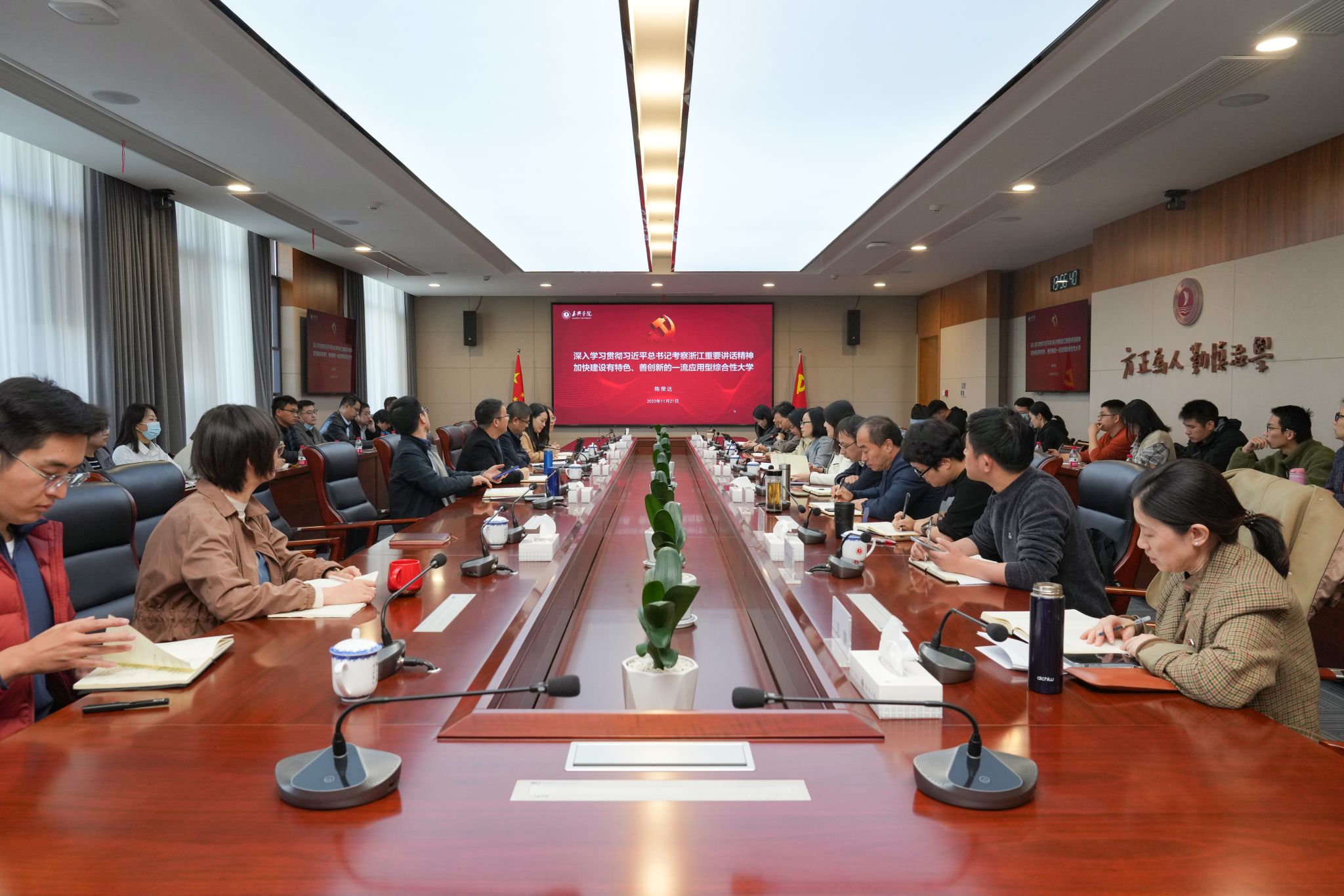 11月21日下午,陈荣达副校长为学校机关党委、数据科学学院和91短视频 师生作“深入学习贯彻习近平总书记考察浙江重要讲话精神 加快建设有特色、善创新的一流应用型综合性大学”宣讲报告会。91短视频 党委书记邵燕主持宣讲会,三个党委班子成员、两个学院全体党支部书记、系部负责人和师生代表到会聆听。