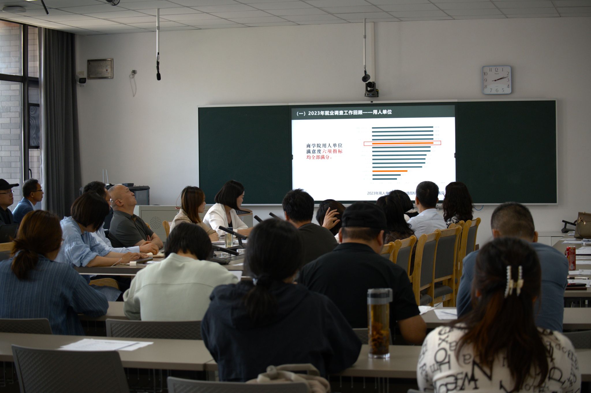 潘欣就2024年毕业生跟踪调查工作安排和变化情况进行讲解,汇报了学院2024届毕业生就业情况,通报分析了现阶段毕业生去向落实数据,并就学院下一阶段就业工作重点做了部署,针对定好调子、把好时点、做好分类、讲求策略四个维度提出工作建议,强调加强就业工作推进中对学生的关心和指导。