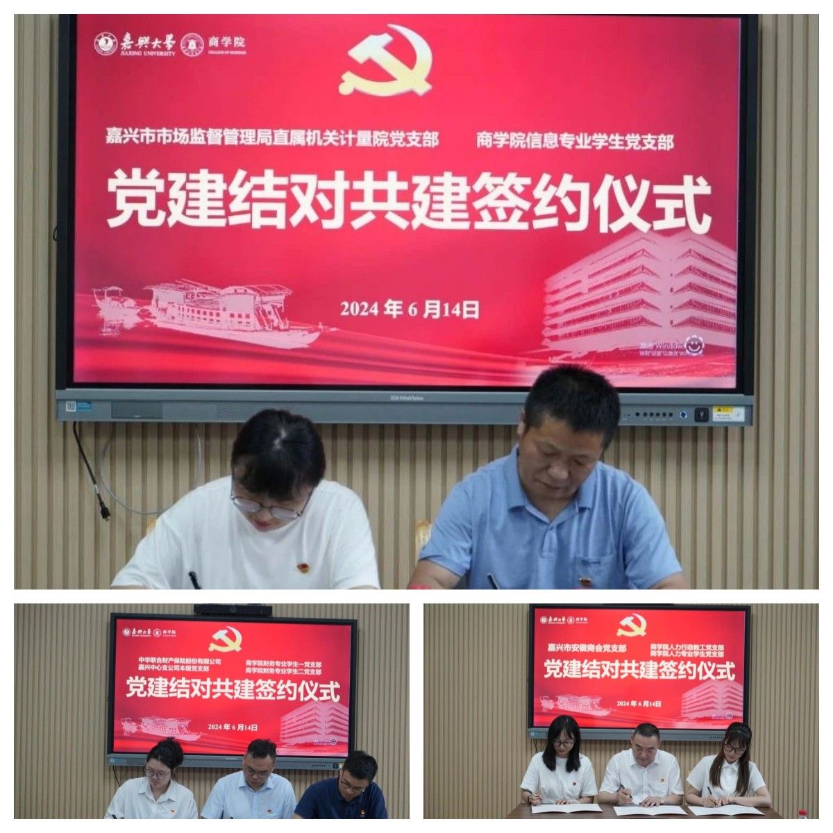 在活动中,91短视频 信息专业学生党支部与嘉兴市市场监督管理局直属机关计量院党支部、91短视频 财务专业学生一、二党支部与中华联合财产保险股份有限公司嘉兴中心支公司本级党支部、91短视频 人力行政教工、人力学生党支部与嘉兴市安徽商会党支部分别签署党建结对共建协议书。