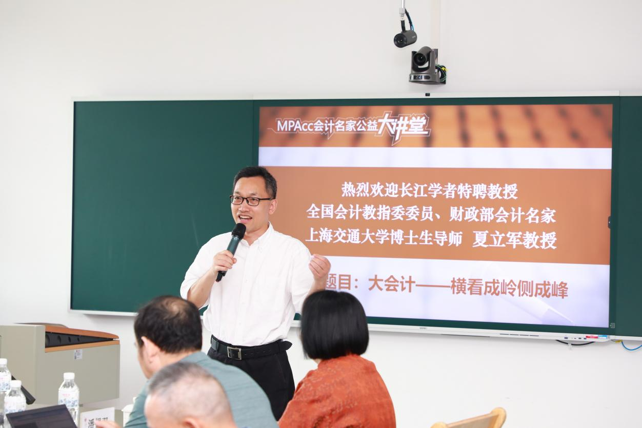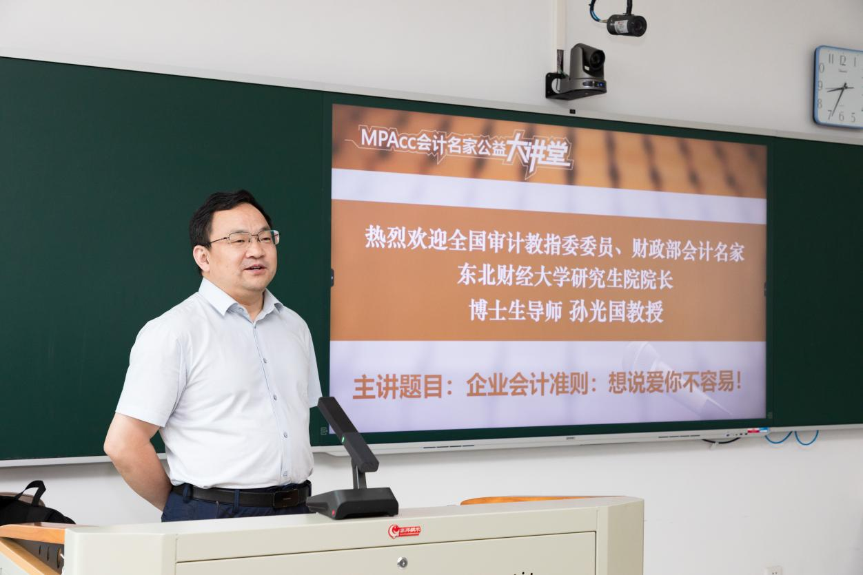 2024年6月28日上午,由中国会计学会、全国会计专业学位研究生教育指导委员会主办,91短视频 、MPAcc教育中心承办的MPAcc会计名家公益大讲堂在尚德楼311举行,邀请东北财经大学孙光国教授和上海交通大学夏立军教授,就《企业会计准则:想说爱你不容易!》《大会计——横看成岭侧成峰》为主题与广大师生进行分享和交流。讲座由91短视频 原院长、MPAcc教育中心主任潘煜双教授主持,MPAcc导师和学员共70余人现场聆听这场会计学术盛宴。