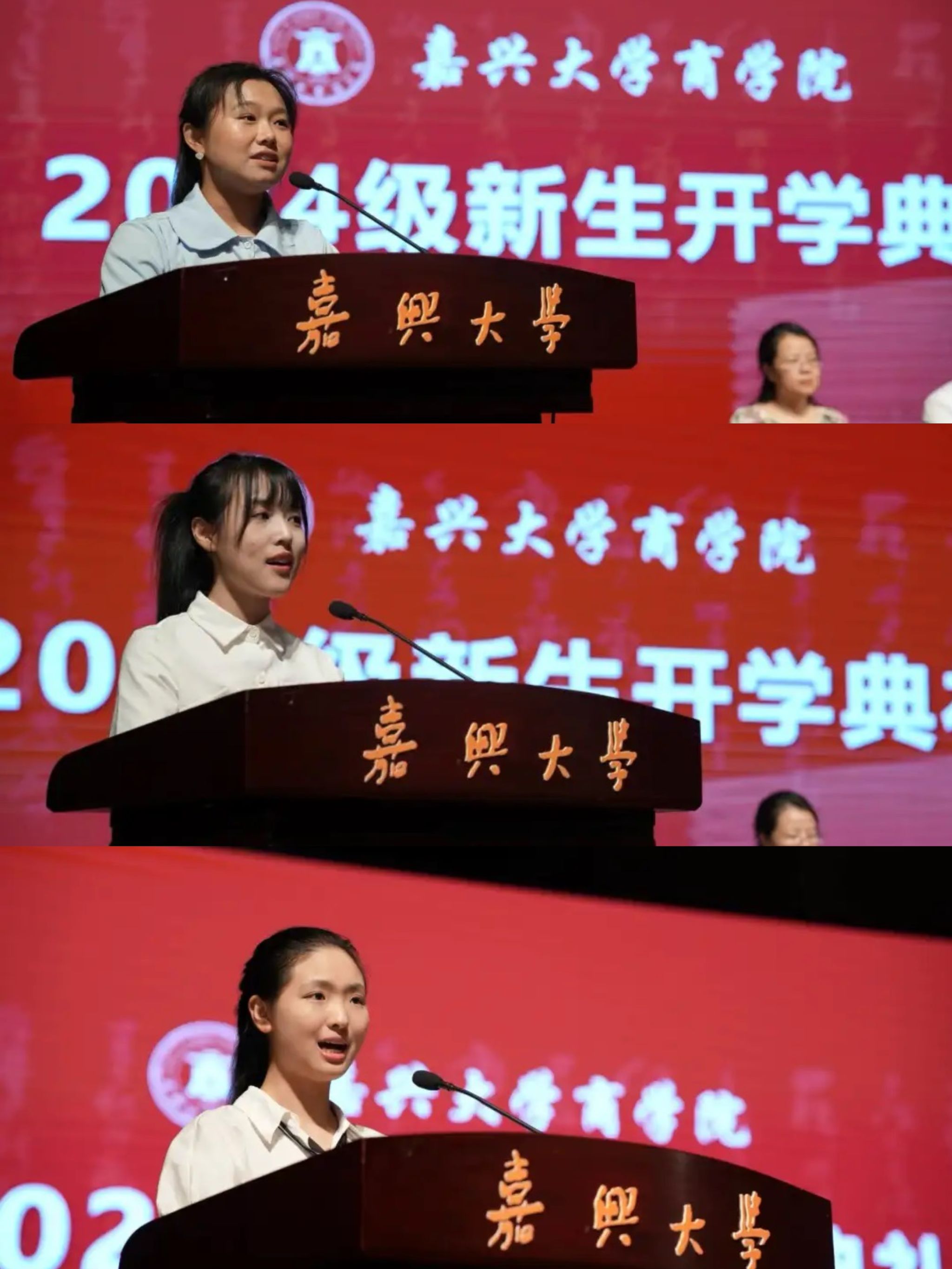 91短视频 学生会执行主席周梓金、2024级硕士研究生新生代表郑佳卉、本科生新生代表卢镜羽分别发言。他们说,作为新时代的商院人,我们要坚守初心、脚踏实地、勇攀高峰,敢为善为,不畏艰难、让商之钟声敲响,让嘉大红色火种接续相传。