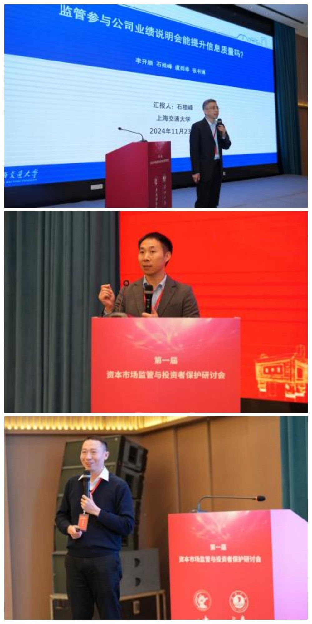 主题报告中,对于监管与公司信息披露质量的关系,上海交通大学安泰经济与管理学院石桂峰教授以“监管参与公司业绩说明会能提升信息质量吗?”为例进行了阐述。石教授认为,信息披露监管是公司信息披露质量的重要保障,也是维护资本市场健康运行的重要基础,监管参与模式具有治理效应,研究发现对于监管机构优化在业绩说明会中的定位,加强对低治理水平公司和低投资者关注公司的差异化监管等方面具有指导意义。厦门大学管理学院罗进辉教授和中央财经大学副教授李哲分别对文章进行精彩点评。