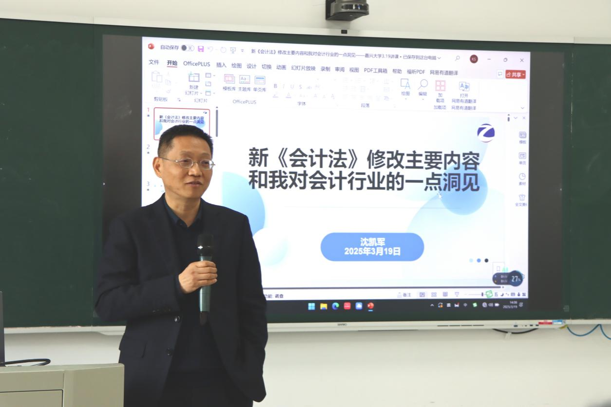 3月19日下午,MPAcc名家讲坛第十五期在尚德楼311精彩开讲,浙江中铭会计师事务所有限公司董事长兼总经理沈凯军担任主讲嘉宾,由MPAcc教育中心主任潘煜双教授主持,会计系、财务系教师代表、2023和2024级会计硕士共计70余人参加。