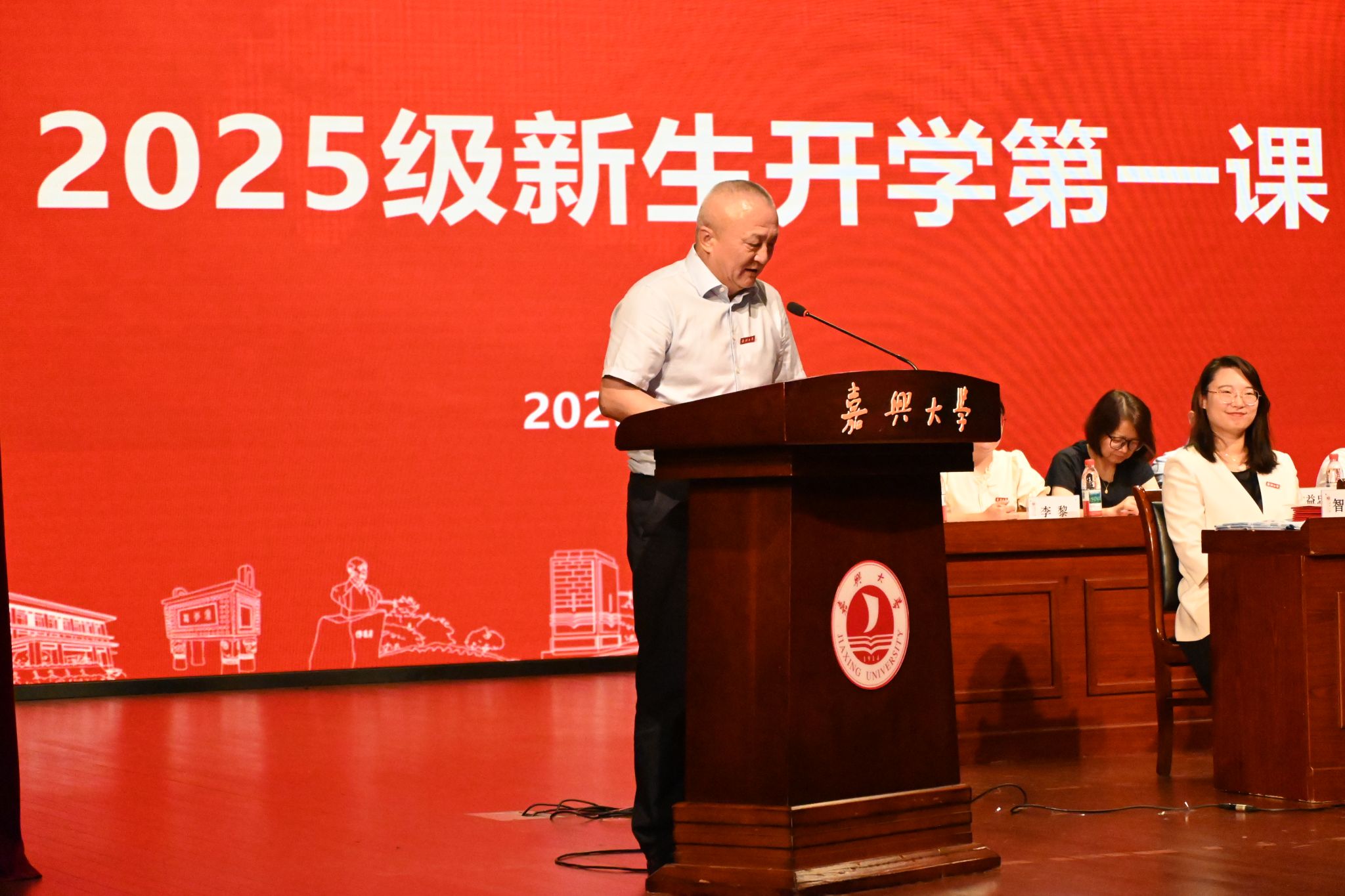 教师代表、南湖优秀青年学者、工商管理系蔡鑫宇以幽默诙谐的语言打破新生对大学 “轻松” 的误解,鼓励同学们培养敢拼、乐观、独立思考三大潜质,以积极心态投身大学自主学习的竞技场。