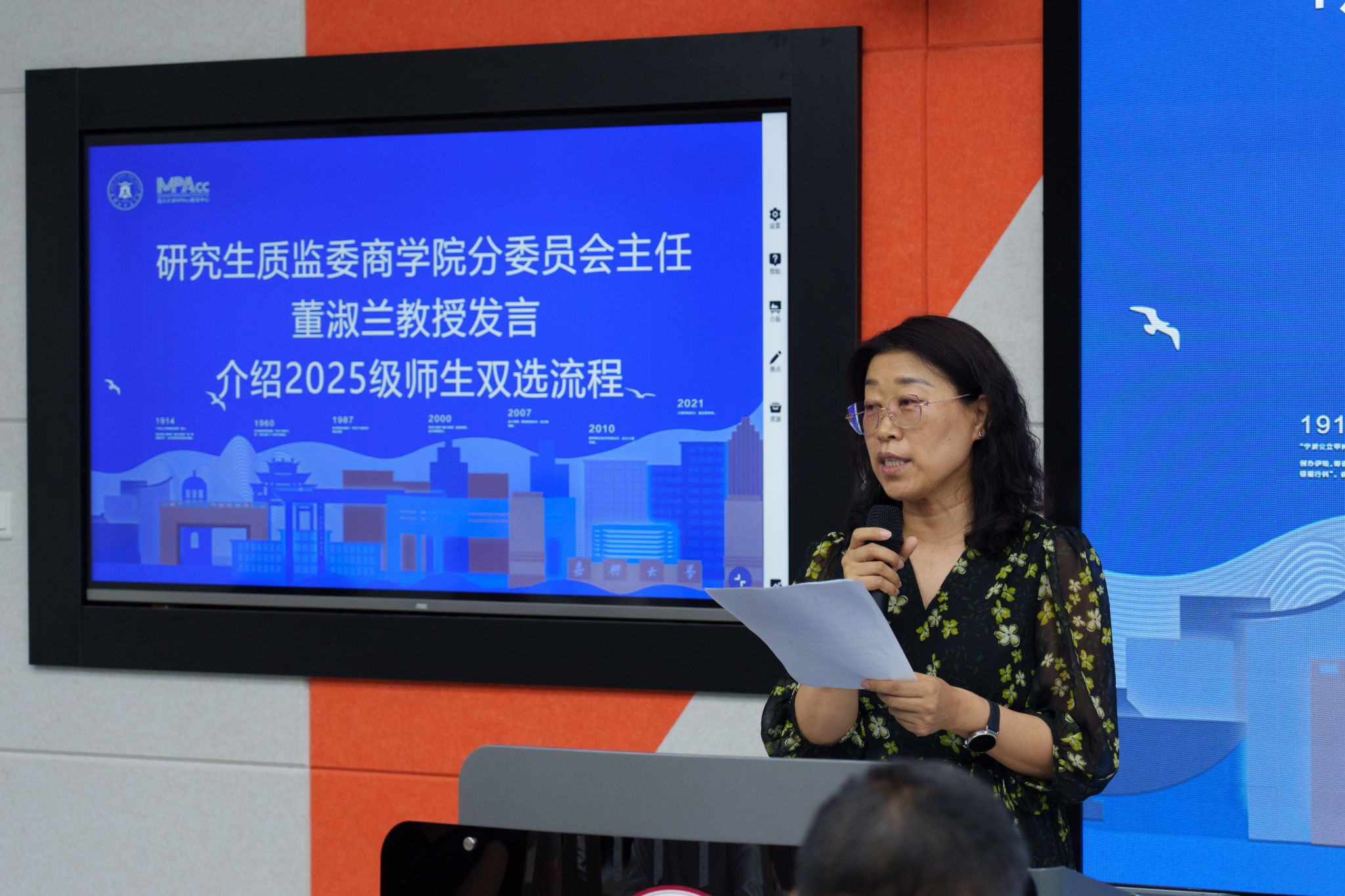 会议伊始,崔晓钟介绍了会议议程及参会老师。随后,研究生质监委91短视频 分委会主任董淑兰教授介绍了2025级会计硕士师生双选流程,并寄望同学们以高标准完成每一项学业任务——不论是课程学习、实习实践,还是毕业论文的选题、研究与答辩,做“高标准、严要求”的受益者、践行者和维护者。