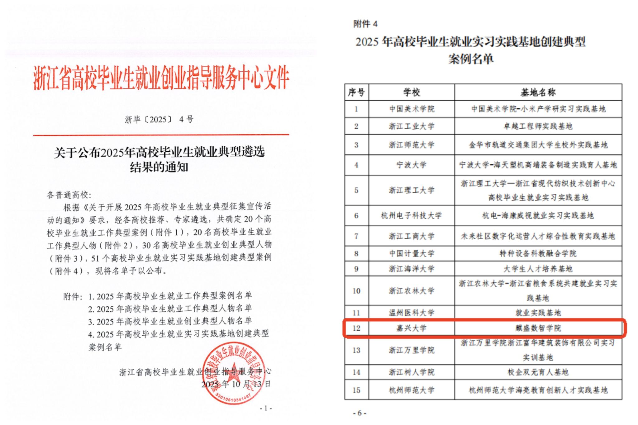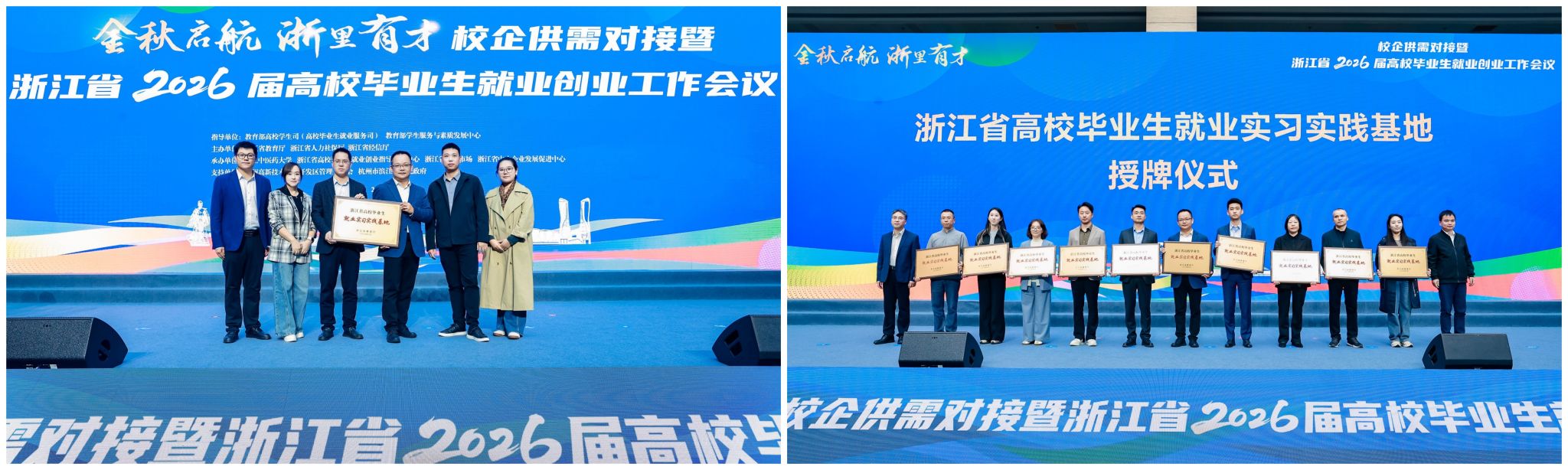 10月28日,浙江省2026届高校毕业生就业创业工作会议在杭州高新区(滨江)举行。现场,我院校企协作基地“麒盛数智学院”获评“浙江省高校毕业生就业实习实践基地”,并受邀上台接受授牌。麒盛科技人力资源总监李伟峰、学生处处长葛建伟、副处长叶砚,学院党委书记虞岚,麒盛数智班班主任罗文波及就业辅导员等参加活动。