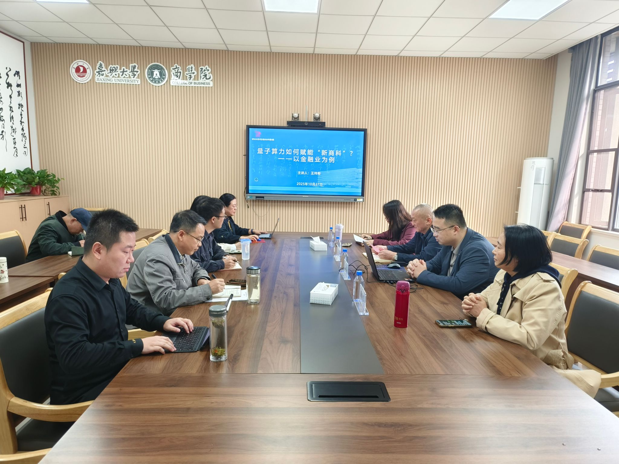 王玮彬以“量子算力如何赋能‘新商科’?——以金融业为例”为题展开分享。他从量子计算的基本概念入手,解析了经典计算与量子计算的核心差异,并对二者进行了系统对比。在此基础上,他进一步梳理了量子计算在商业领域的创新应用,重点结合组合优化问题等典型案例,探讨量子计算如何助力服务实体经济。王玮彬指出,在人工智能、量子计算等新技术快速发展的背景下,商科研究正呈现出“数理化”的研究范式与工程化的团队协作趋势。他进一步强调,推动学科交叉与跨界创新具有重要意义。讲座现场,参会教师与王玮彬教授围绕相关议题展开了积极交流与互动。此次讲座拓宽了老师们的学术视野,也为未来的研究提供了新的参考方向。