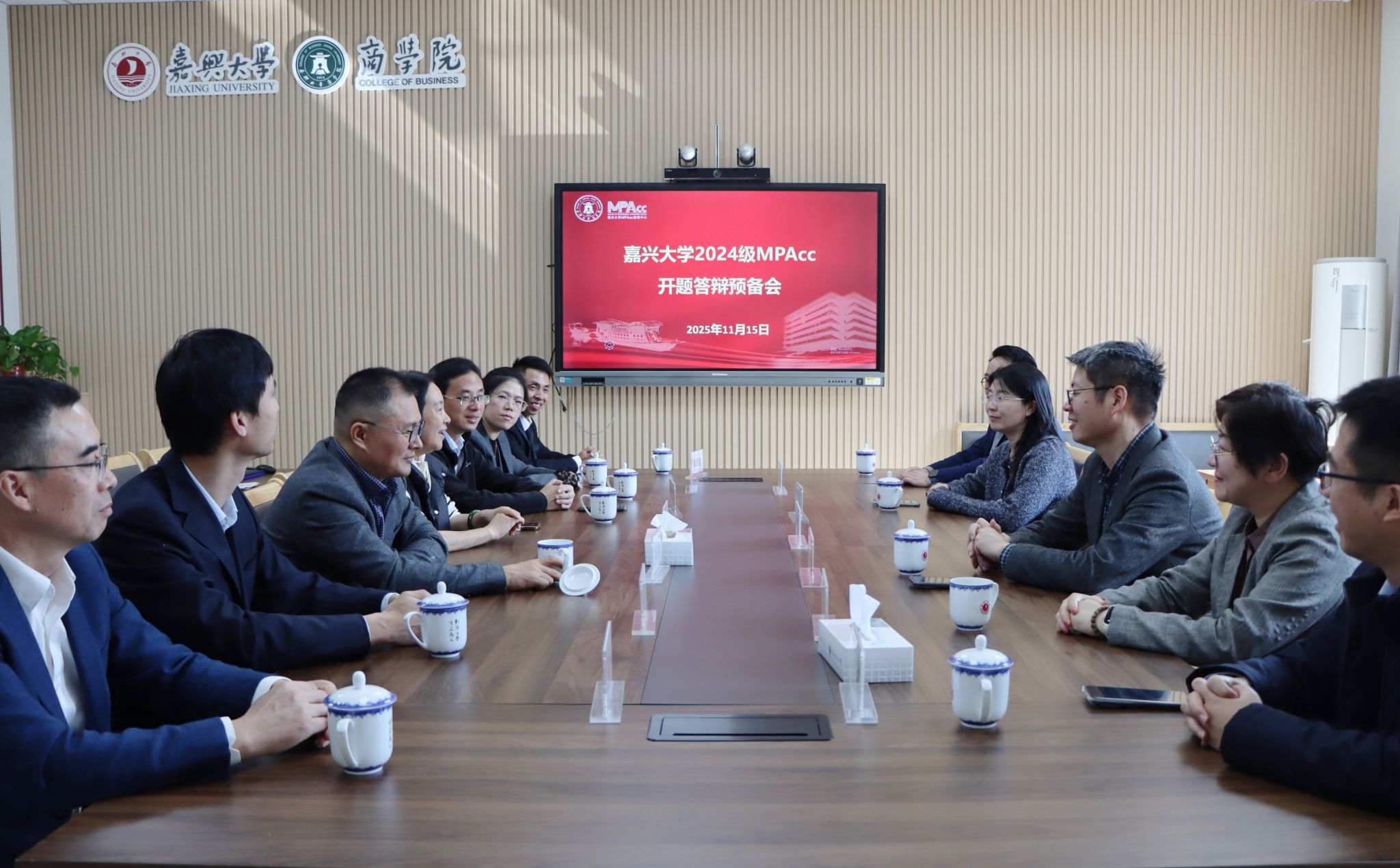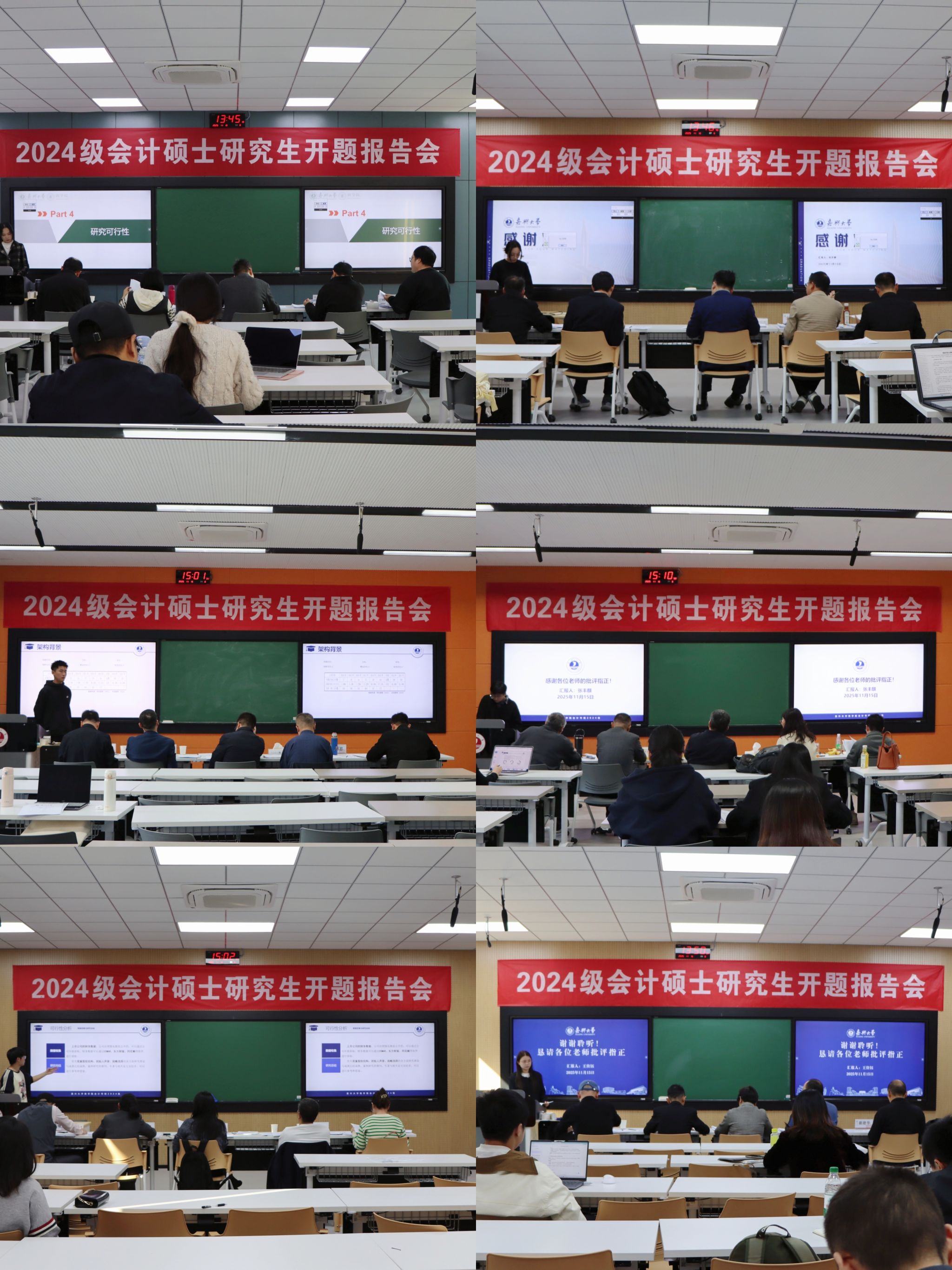 2025年11月15日,MPAcc教育中心顺利组织完成2024级会计硕士研究生开题报告会。报告会分6个小组同时进行,特邀东南大学首席教授陈志斌教授、浙江财经大学会计学院副院长李宗彦教授、南京农业大学金融学院副院长张娆教授、上海师范大学MPAcc教育中心主任黄虹教授、宁波大学MPAcc执行主任陈翼然副教授、上海大学MPAcc项目副主任娄祝坤副教授等6位校外专家担任各小组答辩主席,还邀请了嘉兴南湖实验室科技控股有限公司财务总监王利民、浙江嘉兴国有资本投资运营有限公司副总经理朱鸿涛、嘉兴浙诚税务师事务所所长江一帆、浙江卫星控股股份有限公司财务中心副总监李森柏、浙江中晶科技股份有限公司财务负责人黄朝财、浙江保镖电子有限公司财务总监潘磊等6位行业导师参与开题答辩,充分体现了中心对理论与实践相结合的培养理念。2024级会计硕士研究生全员参加开题答辩,部分2025级会计硕士研究生到现场观摩学习。