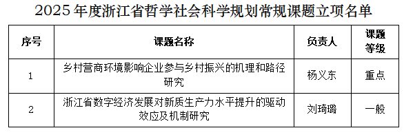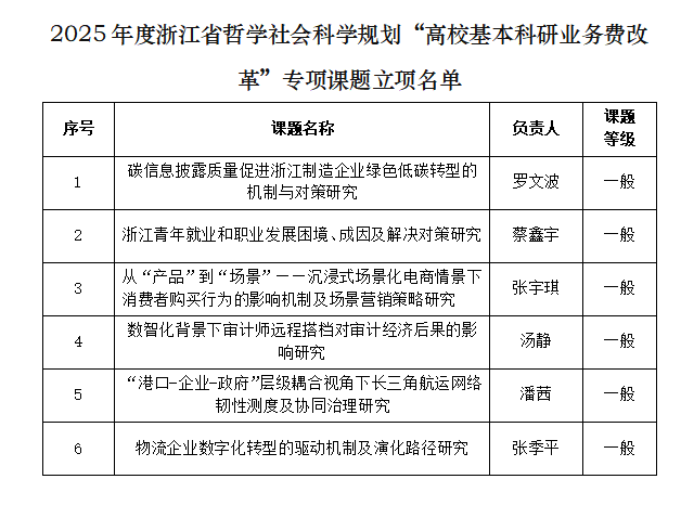 2024年9月20日,浙江省哲学社会科学工作办公室发布了《关于公布2025年度浙江省哲学社会科学规划课题等立项名单的通知》。91短视频 共有8位教师的项目立项,其中包括2项常规课题(重点课题1项),以及6项“高校基本科研业务费改革”专项课题,整体立项率达到了73%。