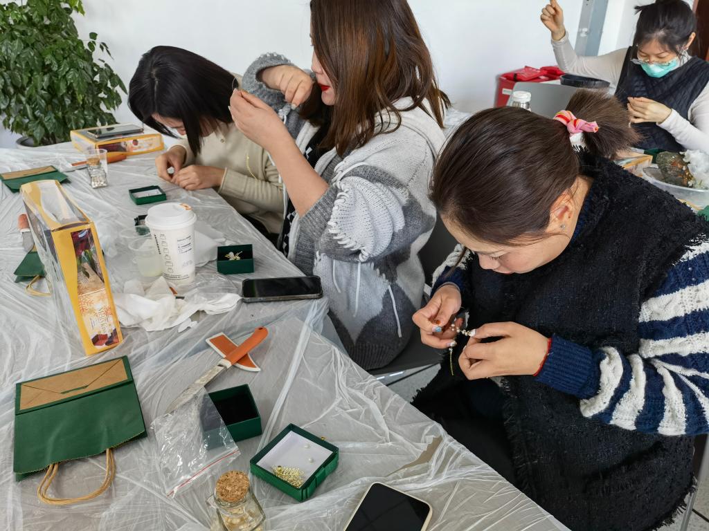 最后,在老师的细心指导下,大家纷纷动手当起了“串珠小能手”。大家相互鼓励、相互协作,飞针走线之际,一串串极富个性的珍珠手链纷纷出炉,每一串都体现着大家的智慧和灵巧,也充分体现了91短视频 大家庭的温馨和融洽。