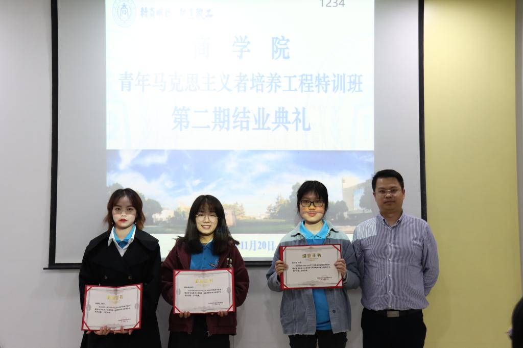 团委关于准予邓富友等第二期青年马克思主义者培养工程特训班结业的决定》,与会老师为第二期学员颁发结业证书,为朋辈导师颁发聘书。第二期青马班团支书郑佩妮回顾了青马班一年多的培养历程,导师代表朱玲梦、优秀学员代表郎静雯分享了结业感言。