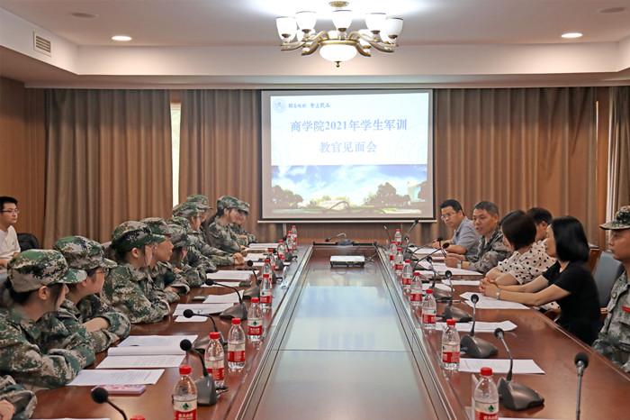2020级学生军训教官见面会在行政楼三楼会议室举行。学院党委书记邵燕、团委书记潘欣、三团十连连长徐超,全体军训教官、指导员、辅导员和各排副排长、卫生员参加见面会。会议由潘欣主持。