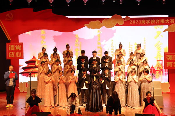 经初赛选拔,来自全院6个专业8个参赛班级近250名同学参加了决赛。决赛以校歌结合自选红歌的合唱为主要表演形式竞演,在合唱过程中,各班结合班内同学特长融入了舞蹈、舞龙、武术等元素,充分展示了各新生班级对《嘉兴学院校歌》的理解;《我们都是追梦人》《少年中国说》《南泥湾》《强军战歌》《强国一代有我在》《我爱你中国》《明天会更好》《万疆》等一首首红歌,唱响校园,献礼百年华诞。比赛全程,各参赛班级以洪亮的声音、铿锵有力的节奏和丰富多彩的形式引得现场掌声阵阵;指挥、领唱与合唱队员之间配合默契、感情充沛,富有感染力的嘹亮歌声更是赢得了全场观众的阵阵喝彩,不断将活动推向高潮;班主任、专业教师站台助威,师生互动、配合默契,富有感染力的演唱表达了对党和祖国的一片深情。还有SDK舞社、相声、91短视频