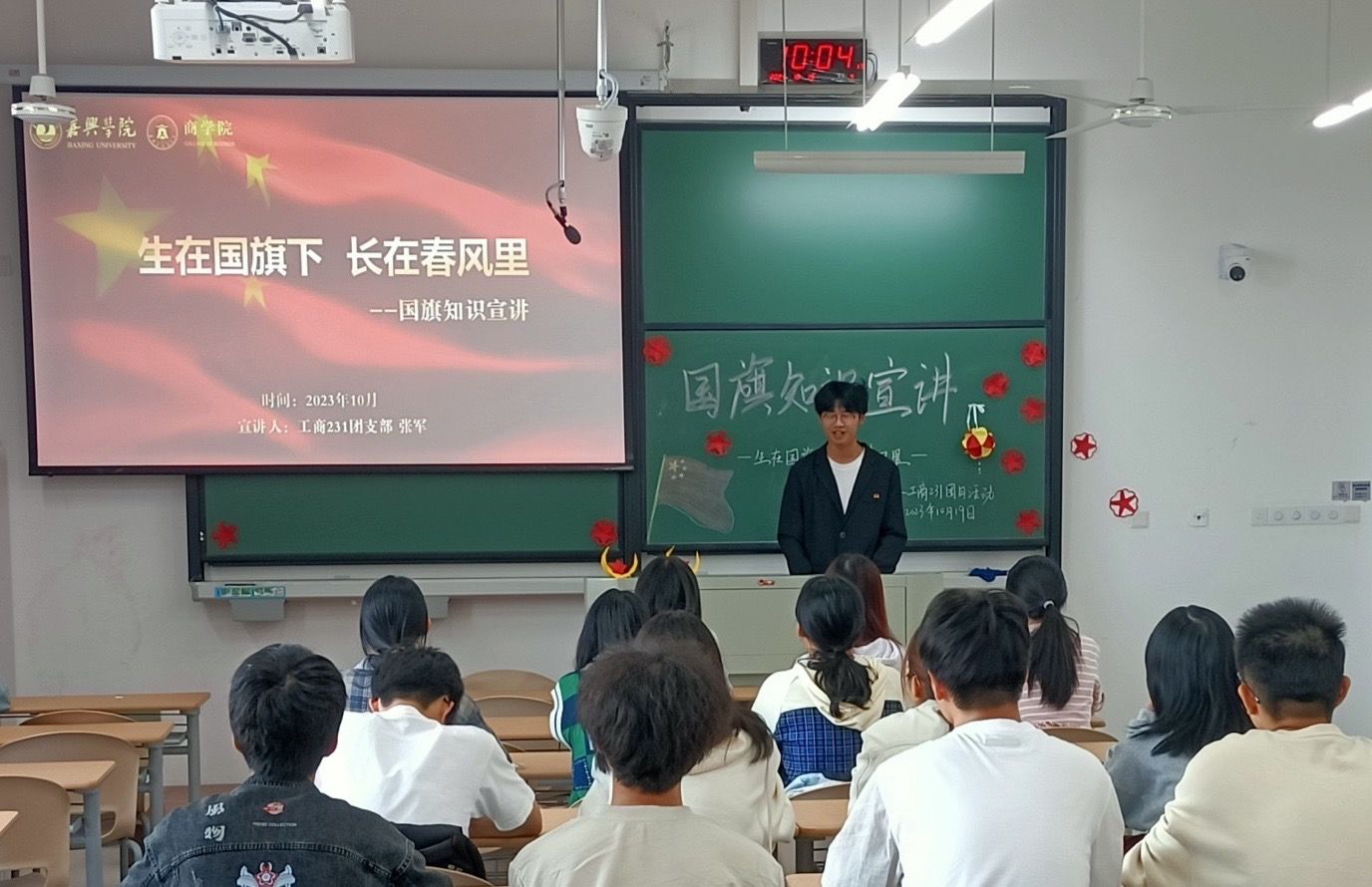 活动在《飘扬着的‘中国红’》短视频中拉开帷幕,展现了飘扬在祖国各地的五星红旗。活动围绕国旗的设计、《国旗法》的修订、国旗的象征意义展开,学院国旗班成员刘雅萱同学为大家分享加入国旗班的初心、讲解如何正确使用国旗,通过《红岩》中革命先辈们对国旗的热爱激发在座青年的爱国热情,不断增强时代责任感和使命感。活动接近尾声,刘永杰老师寄语广大青年通过学习国旗精神,要进一步坚定听党话、跟党走的理想信念,将小我融入祖国大我,厚植爱国主义情怀,在谱写中国式现代化嘉兴新篇章中奏响壮丽的青春之歌。
