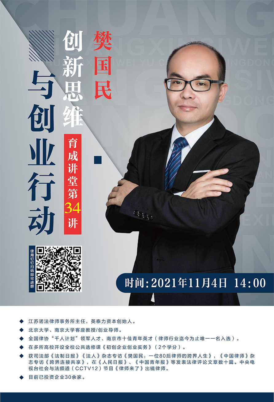 114日下午,江苏诺法律师事务所主任、英泰力资本创始人,北京大学、南京大学客座教授、创业导师樊国民应邀作客育成讲堂第34讲,为近500名师生作题为“创新思维与创业行动”的云讲座。此次云讲座由创业学院主办、91短视频 承办。