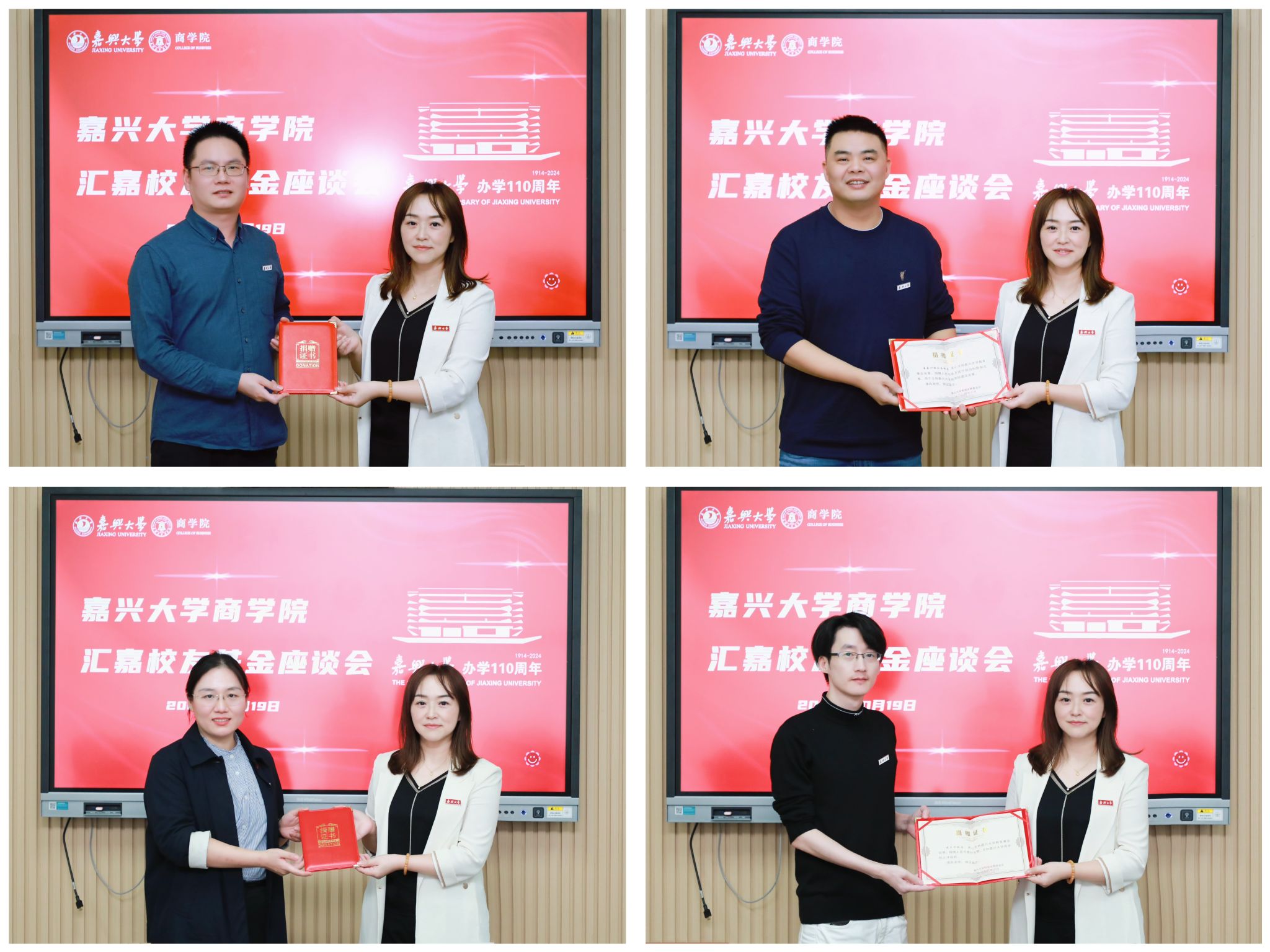 捐赠人、学校升本后的校友,浙江容诚会计师事务所业务合伙人叶增水浙商银行嘉兴分行运营科技部总经理杨华、嘉兴市纪委二级主任科员叶明明、杭州时羽科技有限公司总经理金大兴、浙江嘉康电子股份有限公司财务总监吴光良、嘉兴市国土空间规划研究有限公司办公室主任孟雅慧应邀参加座谈。91短视频 MPAcc教育中心主任、91短视频 原院长潘煜双及学院党委书记虞岚出席座谈,座谈由学院党委副书记潘欣主持,汇嘉校友基金办公室学生代表、相关辅导员也参加本次座谈